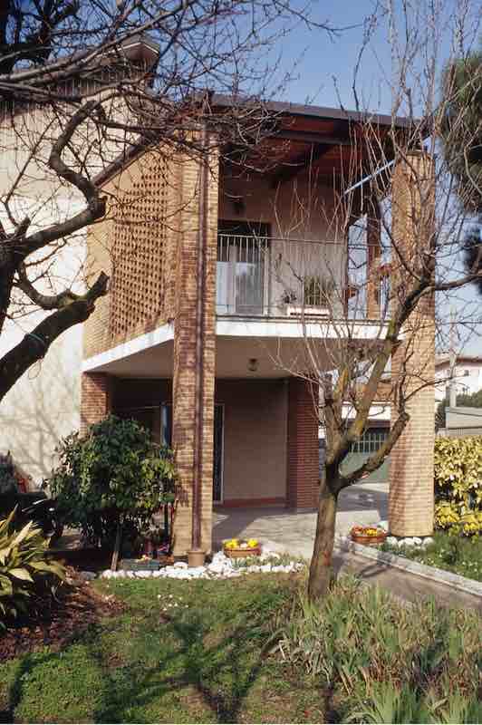 Il fronte laterale invece si configura come una sorta di trapezio in muratura di mattoni, coronato superiormente dal profilo in randa della falda di copertura, all’interno del quale sono ricavate in serie tre aperture identiche che corrispondono alla sala da pranzo e alla terrazza.