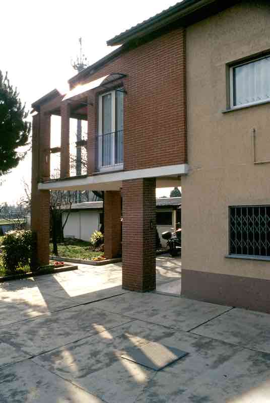 Questa soluzione non solo “contraddice” l’ortogonalità dell’edificio originario introducendo nella composizione un motivo più spiccatamente moderno, ma permette anche di “inquadrare assialmente” il percorso rettilineo del giardino ora concluso simmetricamente dall’avancorpo dell’ampliamento che crea una zona coperta davanti all’ingresso.